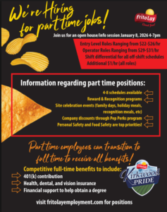 Frito Lay will be hosting a open house to share information about their part-time positions, competitive benefits and company culture.