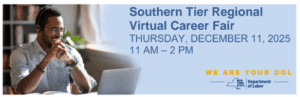 Look for a new career from the comfort of your home! Visit the Southern Tier Regional Virtual Career Fair online and view local companies and state agencies online on Thursday, October 16 11am-2pm. You would also have the opportunity to share your resume with recruiters.